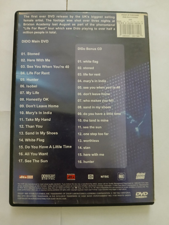آلبوم موسیقی اوریجینال کنسرت تصویری " Dido " ( دایدو ) با اسم آلبوم ( Live In Brixton Academy ) در سبک یا ژانر موسیقی Electronic/Electropop/Synth-Pop که توسط خواننده و ترانه سرای انگلیسی فوق منتشر شد . عکس شماره یک و دو عکس روی دی وی دی اوریجینال و کد دیجیتالی و شماره کاتالوگ دی وی دی که اصلی ترین نشان دی وی دی شرکتی و اوریجینال است می باشد .