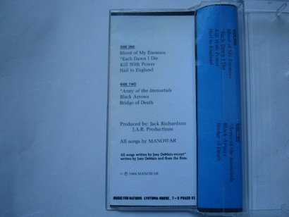 نوار کاست موسیقی " Manowar 1984 " با اسم آلبوم ( Hail to England ) در سبک ها یا ژانر موسیقی با اسامی فارسی هوی متال /پاور متال و نام انگلیسی Heavy Metal/Power Metal از بند موسیقی بالا که این آلبوم اولین کار موسیقی منتشر شده آنهاست .
